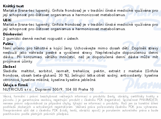 Maitake (trsnatec lupenitý, Grifola frondosa) je v tradiční čínské medicíně využívána pro její schopnost pročišťovat organismus a harmonizovat metabolismus.