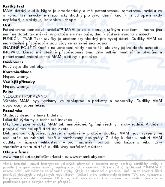 MAM dětský dudlík Night je ortodontický a má patentovanou sametovou savičku ze silikonu. Tvar savičky je anatomicky vhodný pro vývoj dásní. Knoflík na uchopení nikdy nepřekáží, ale vždy jej lze dobře uchopit.