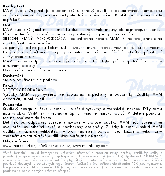MAM dudlík Original je ortodontický silikonový dudlík s patentovanou sametovou savičkou. Tvar savičky je anatomicky vhodný pro vývoj dásní. Knoflík na uchopení nikdy nepřekáží.