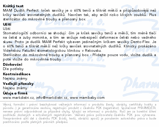 MAM Dudlík Perfect: krček savičky je o 60% tenčí a třikrát měkčí a přizpůsobivější než krčky saviček srovnatelných dudlíků. Navržen tak, aby snížil riziko křivých zoubků. Plus sterilizátor do mikrovlné trouby a přenosný box.
