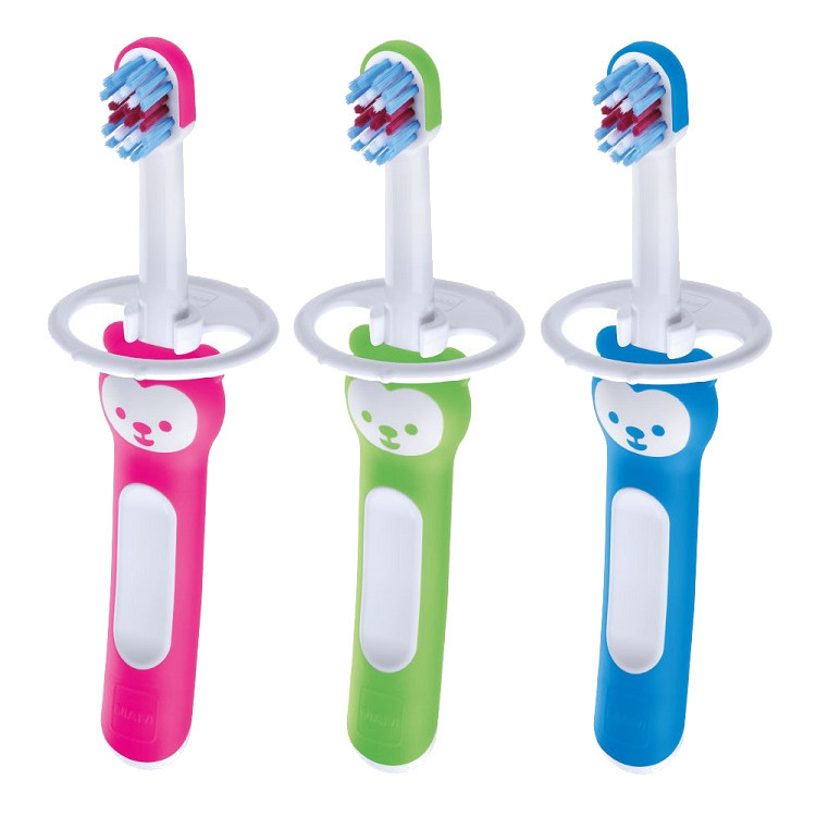 Baby Brush-Kartáček na zuby, s velmi měkkými štětinami. Určen pro děti od 6. měsíce, nebo od 1.zoubku. Zaoblené štětiny čistí první zoubky a odstraňují plak a bakterie. Masážní hlava na spodním konci rukojeti pro masáž dásní i čištění jazyka.