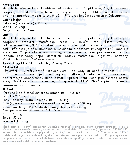 MamaHelp díky unikátní kombinaci přírodních extraktů pískavice, fenyklu a anýzu podporuje produkci mateřského mléka u kojících žen. Příjem DHA v mateřství přispívá k normálnímu vývoji mozku kojených dětí1. Přípravek je dále obohacen o Colostrum.