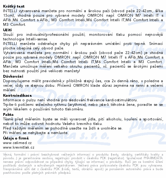 INTELLI vytvarovaná manžeta pro normální a širokou paži (obvod paže 22-42cm, šířka 15cm), vhodná pouze pro vybrané modely OMRON: např. OMRON M7 Intelli IT s AFib,M6 Comfort s AFib, M3 Comfort Intelli,M6 Comfort Intelli IT,M6 Comfort Intelli a M3 Comfort.