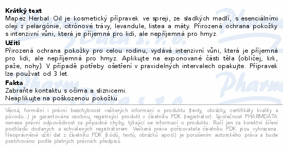 Mapez Herbal Oil je kosmetický přípravek ve spreji, ze sladkých madlí, s esenciálními oleji z pelargónie, citrónové trávy, levandule, listea a máty. Přirozená ochrana pokožky s intenzivní vůni, která je příjemná pro lidi, ale nepříjemná pro hmyz.