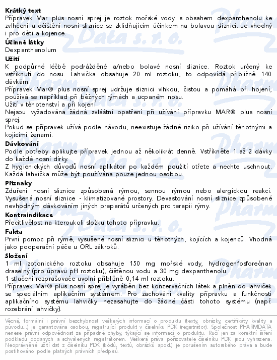 Přípravek Mar plus nosní sprej je roztok mořské vody s obsahem dexpanthenolu ke zvlhčení a očištění nosní sliznice se zklidňujícím účinkem na bolavou sliznici. Je vhodný i pro děti a kojence.