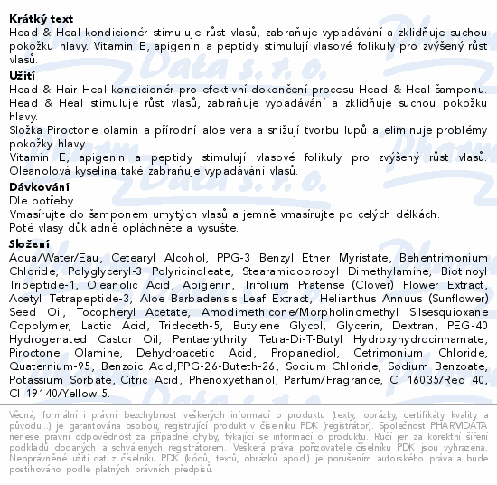 Head & Heal kondicionér stimuluje růst vlasů, zabraňuje vypadávání a zklidňuje suchou pokožku hlavy. Vitamin E, apigenin a peptidy stimulují vlasové folikuly pro zvýšený růst vlasů.