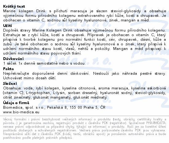 Marine kolagen Drink s příchutí maracuja je slazen steviol-glykosidy a obsahuje výjimečnou formu přírodního kolagenu extrahovaného rybí kůže, kostí a chrupavek. Je obohacen o vitamín C, sodnou sůl kyseliny hyaluronové, zinek, mangan a měď.