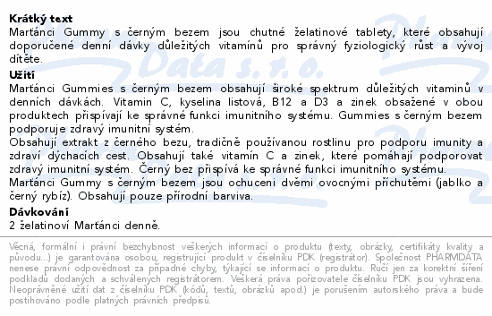Marťánci Gummi s černým bezem jsou chutné želatinové tablety, které obsahují doporučené denní dávky důležitých vitamínů pro správný fyziologický růst a vývoj dítěte. Jedná se o doplněk stravy pro děti obsahující extrakt z černého bezu, vitamin C a zinek.