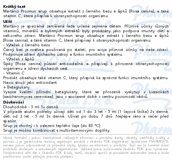 Marťánci Proimun sirup obsahuje extrakt z černého bezu a šípků (Rosa canina), a také vitamin C, které přispívá k obranyschopnosti organismu.