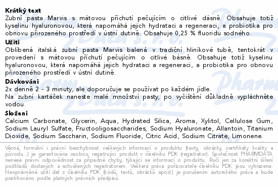 Zubní pasta Marvis s mátovou příchutí pečujícím o citlivé dásně. Obsahuje totiž kyselinu hyaluronovou, která napomáhá jejich hydrataci a regeneraci, a probiotika pro obnovu přirozeného prostředí v ústní dutině. Obsahuje 0,25 % fluoridu sodného.