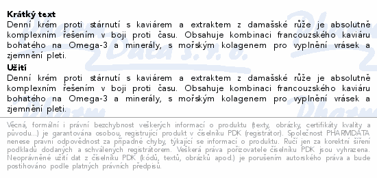 Denní krém proti stárnutí s kaviárem a extraktem z damašské růže je absolutně komplexním řešením v boji proti času. Obsahuje kombinaci francouzského kaviáru bohatého na Omega-3 a minerály, s mořským kolagenem pro vyplnění vrásek a zjemnění pleti.