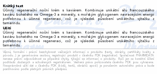 Účinný regenerační noční krém s kaviárem. Kombinuje unikátní sílu francouzského kaviáru bohatého na Omega-3 a minerály, s mořským glykogenem navracejícím energii potřebnou k účinné regeneraci, což je výsledek působení unikátního výtažku z tamarindu.