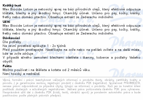 Max Biocide Lotion je netoxický sprej na bázi přírodních olejů, který efektivně odpuzuje klíšťata, blechy a jiný škodlivý hmyz. Okamžitý účinek. Určeno pro psy, kočky, králíky, fretky nebo domácí ptactvo. Obsahuje extrakt ze Zederachu indického.