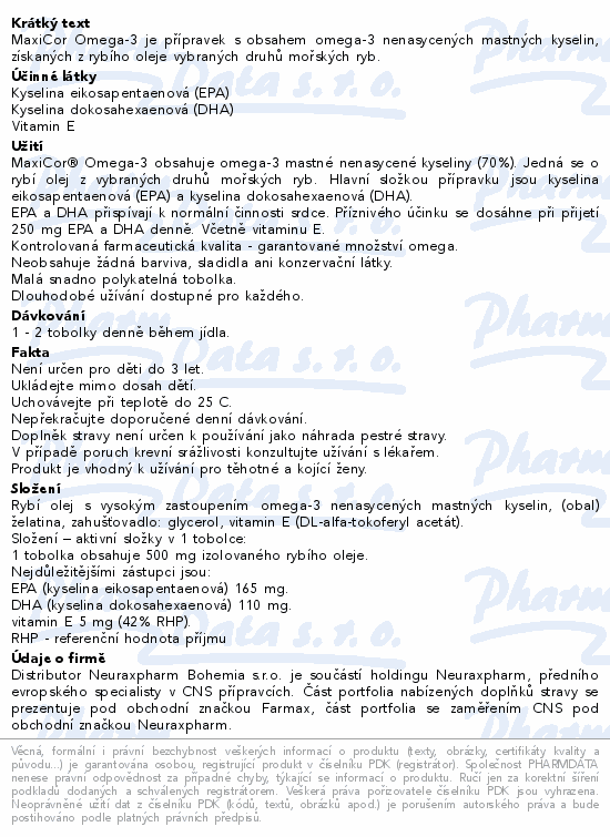 MaxiCor Omega-3 je přípravek s obsahem omega-3 nenasycených mastných kyselin, získaných z rybího oleje vybraných druhů mořských ryb.