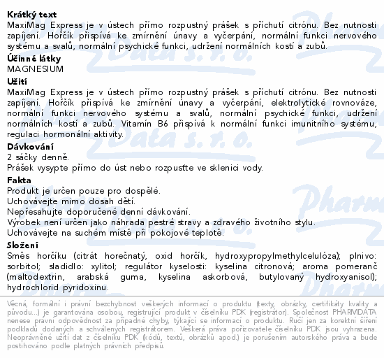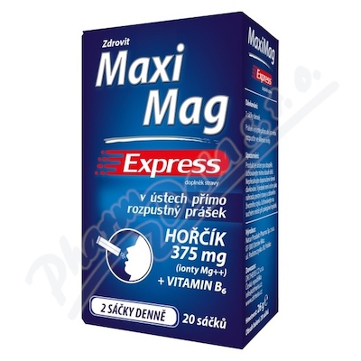 MaxiMag Express je v ústech přímo rozpustný prášek s příchutí citrónu. Bez nutnosti zapíjení. Hořčík přispívá ke zmírnění únavy a vyčerpání, normální funkci nervového systému a svalů, normální psychické funkci, udržení normálních kostí a zubů.