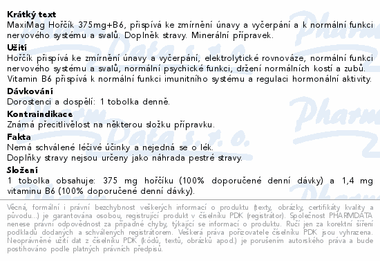MaxiMag Hořčík 375mg+B6, přispívá ke zmírnění únavy a vyčerpání a k normální funkci nervového systému a svalů. Doplněk stravy. Minerální přípravek.