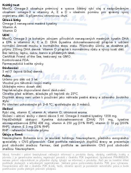 MaxIQ Omega-3 obsahuje prémiový a vysoce čištěný rybí olej s nadprůměrným obsahem omega-3 a vitaminy A, E a D v ideálním poměru pro správný vývoj organismu dětí. S příjemnou citronovou chutí.
