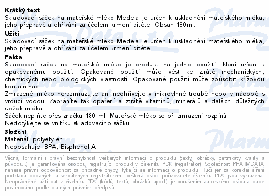 Skladovací sáček na mateřské mléko Medela je určen k uskladnění mateřského mléka, jeho přepravě a ohřívání za účelem krmení dítěte. Obsah 180ml.