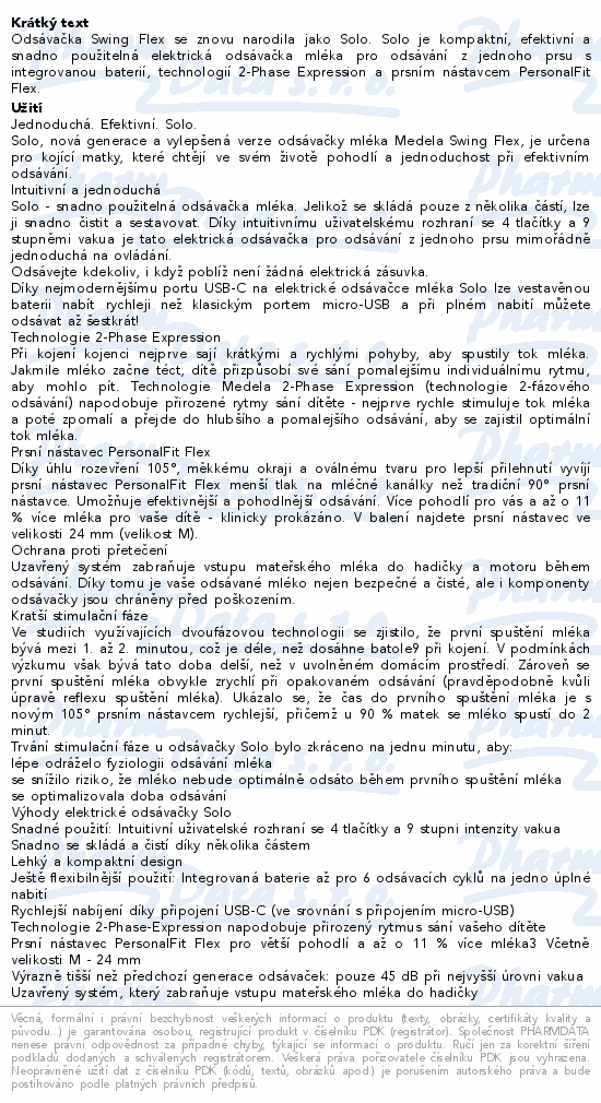 Odsávačka Swing Flex se znovu narodila jako Solo. Solo je kompaktní, efektivní a snadno použitelná elektrická odsávačka mléka pro odsávání z jednoho prsu s integrovanou baterií, technologií 2-Phase Expression a prsním nástavcem PersonalFit Flex.