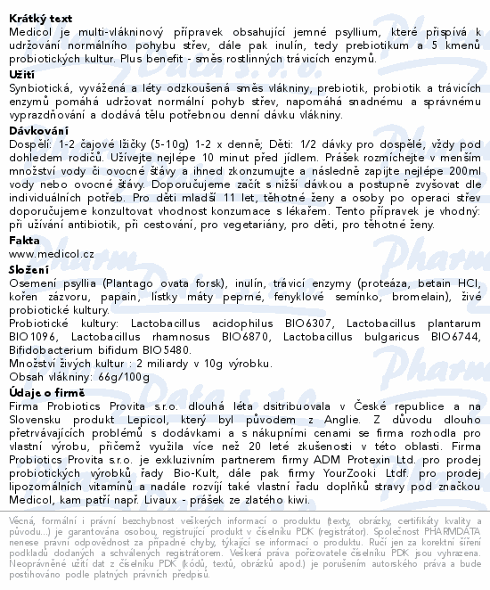 Medicol plus je multivlákninový přípravek obsahující jemné psyllium, které přispívá k udržování normálního pohybu střev, dále pak inulín, tedy prebiotickou vlákninu. Tyto dvě složky vám mohou pomoci zajistit si doporučovanou denní dávku vlákniny. Třetí klíčovou složkou je 5 kmenů živých kultur, které se přirozeně vyskytují v trávicím ústrojí zdravého člověka. Medicol plus má pro vís extra benefit - obsahuje směs rostlinných trávicích enzymů, které pomáhají lépe rozkládat potravu v trávicícm ústrojí.