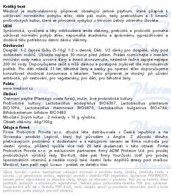 Medicol je multivlákninový přípravek obsahující jemné psyllium, které přispívá k udržování normálního pohybu střev, dále pak inulín, tedy prebiotickou vlákninu. Tyto dvě složky vám mohou pomoci zajistit si doporučovanou denní dávku vlákniny. Třetí klíčovou složkou je 5 kmenů živých kultur, které se přirozeně vyskytují v trávicím ústrojí zdravého člověka.