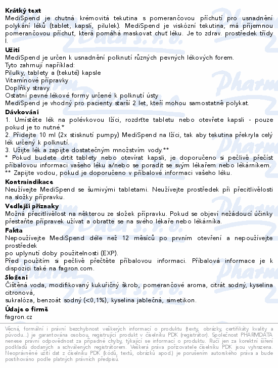 MediSpend je chutná krémovitá tekutina s pomerančovou příchutí pro usnadnění polykání léků (tablet, kapslí, pilulek). MediSpend je viskózní tekutina, má příjemnou pomerančovou příchuť, která pomáhá maskovat chuť léku. Je to zdrav. prostředek třídy I.