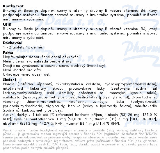 B-komplex Basic je doplněk stravy s vitaminy skupiny B včetně vitaminu B6, který podporuje správnou činnost nervové soustavy a imunitního systému, pomáhá snižovat míru únavy a vyčerpání.