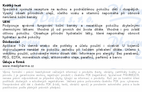 Speciálně vyvinutá receptura na suchou a podrážděnou pokožku dětí i dospělých. Vysoký obsah přírodních olejů, včelího vosku a vitaminů napomáhá při obnově narušené kožní bariéry.