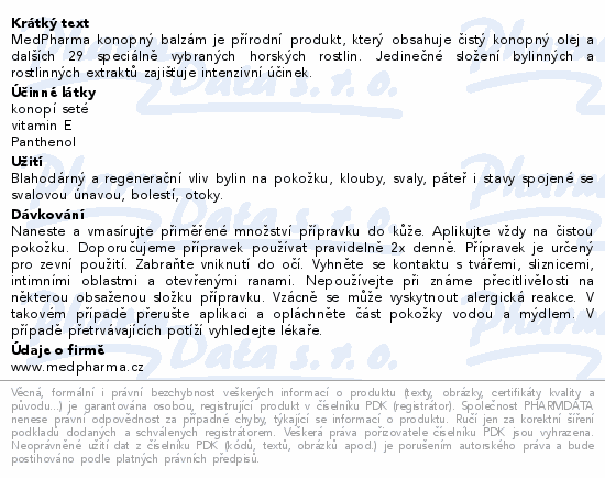 MedPharma konopný balzám je přírodní produkt, který obsahuje čistý konopný olej a dalších 29 speciálně vybraných horských rostlin. Jedinečné složení bylinných a rostlinných extraktů zajišťuje intenzivní účinek.