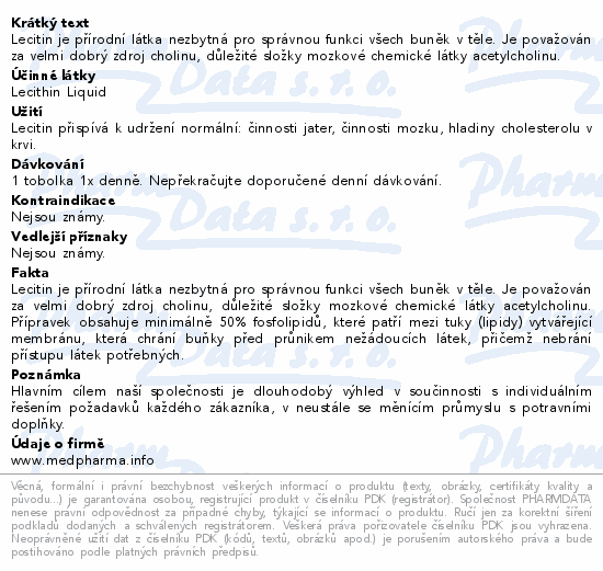 Lecitin je přírodní látka nezbytná pro správnou funkci všech buněk v těle. Je považován za velmi dobrý zdroj cholinu, důležité složky mozkové chemické látky acetylcholinu.
