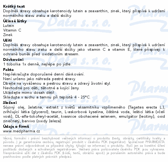 Doplněk stravy obsahuje karotenoidy lutein a zeaxanthin, zinek, který přispívá k udržení normálního stavu zraku a další složky.
