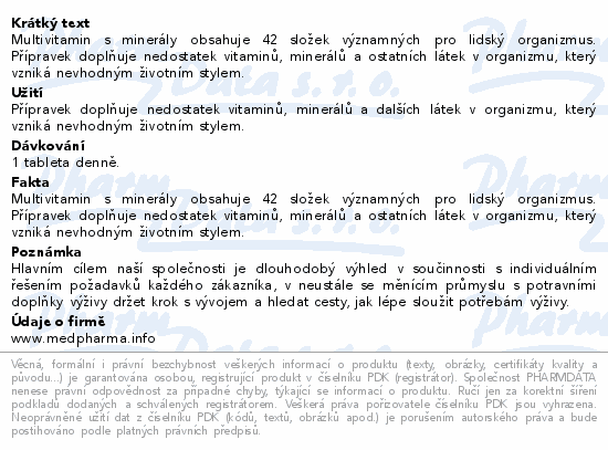 Multivitamin s minerály obsahuje 42 složek významných pro lidský organizmus. Přípravek doplňuje nedostatek vitaminů, minerálů a ostatních látek v organizmu, který vzniká nevhodným životním stylem.
