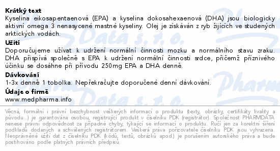 Kyselina eikosapentaenová (EPA) a kyselina dokosahexaenová (DHA) jsou biologicky aktivní omega 3 nenasycené mastné kyseliny. Olej je získáván z ryb žijících ve studených arktických vodách.