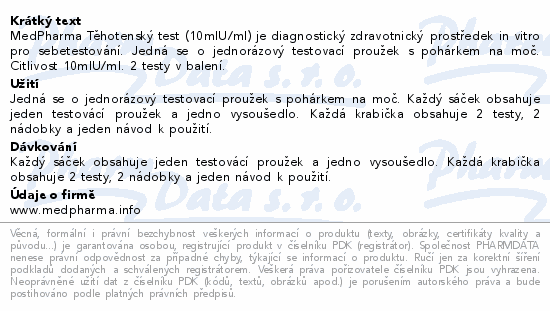 MedPharma Těhotenský test (10mlU/ml) je diagnostický zdravotnický prostředek in vitro pro sebetestování. Jedná se o jednorázový testovací proužek s pohárkem na moč. Citlivost 10mlU/ml. 2 testy v balení.