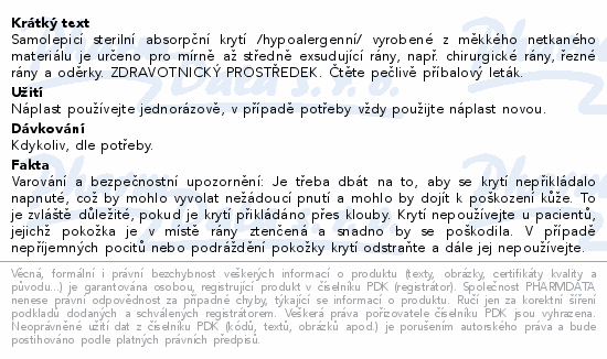 Samolepicí sterilní absorpční krytí /hypoalergenní/ vyrobené z měkkého netkaného materiálu je určeno pro mírně až středně exsudující rány, např. chirurgické rány, řezné rány a oděrky. ZDRAVOTNICKÝ PROSTŘEDEK. Čtěte pečlivě příbalový leták.