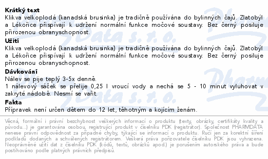 Klikva velkoplodá (kanadská brusinka) je tradičně používána do bylinných čajů. Zlatobýl a Lékořice přispívají k udržení normální funkce močové soustavy. Bez černý posiluje přirozenou obranyschopnost.