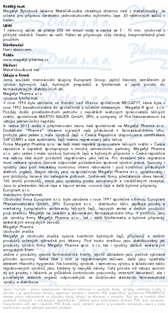 | Výrobce: | MEGAFYT PHARMA S.R.O. , VRANÉ NAD VLTAVOU |