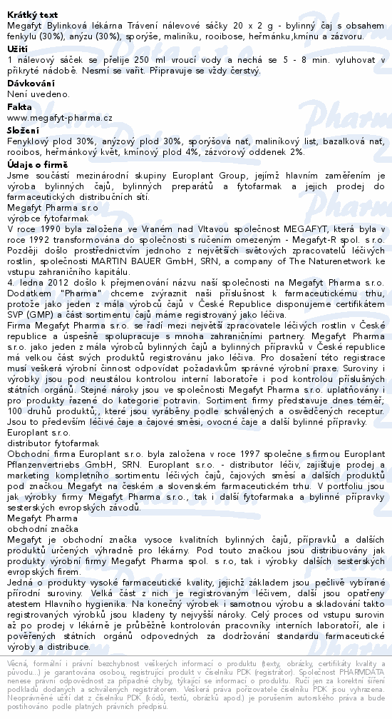 Megafyt Bylinková lékárna Trávení nálevové sáčky 20 x 2 g - bylinný čaj s obsahem fenkylu (30%), anýzu (30%), sporýše, maliníku, rooibose, heřmánku,kmínu a zázvoru.