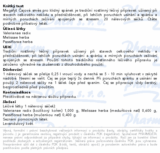 Megafyt Čajová směs pro klidný spánek je tradiční rostlinný léčivý přípravek užívaný při stavech celkového neklidu a předrážděnosti, při lehčích poruchách usínání a spánku a mírných poruchách zažívání spojených se stresem. 20 nálevových sáčků. Čtěte pozorně příbalový leták.