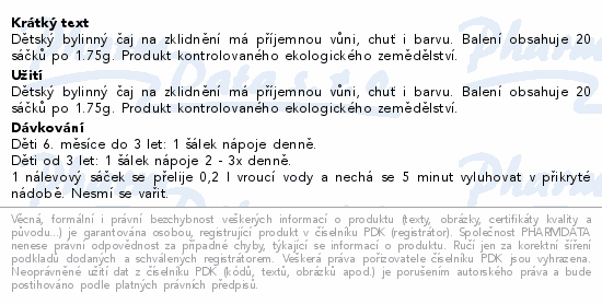 Dětský bylinný čaj na zklidnění má příjemnou vůni, chuť i barvu. Balení obsahuje 20 sáčků po 1.75g. Produkt kontrolovaného ekologického zemědělství.