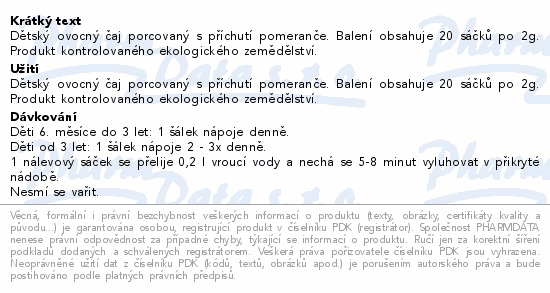 Dětský ovocný čaj porcovaný s příchutí pomeranče. Balení obsahuje 20 sáčků po 2g. Produkt kontrolovaného ekologického zemědělství.