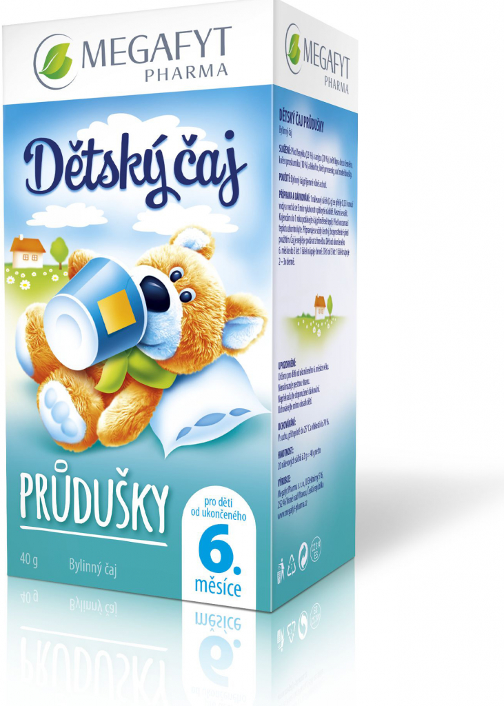 Megafyt Dětský průduškový čaj. Bylinný čaj příjemné vůně a chuti. Plod fenyklu (25 %) a anýzu (20 %), květ lípy a bezu černého, kořen proskurníku (10 %) a lékořice, květ prvosenky, nať mateřídoušky.