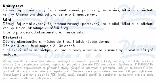 Dětský čaj zimní-ovocný čaj aromatizovaný, porcovaný, se skořicí, lékořicí a příchutí vanilky. Určeno pro děti od ukončeného 6. měsíce věku.