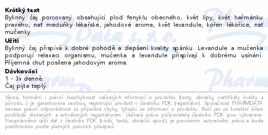 Bylinný čaj porcovaný obsahující plod fenyklu obecného, květ lípy, květ heřmánku pravého, nať meduňky lékařské, jahodové aroma, květ levandule, kořen lékořice, nať mučenky.