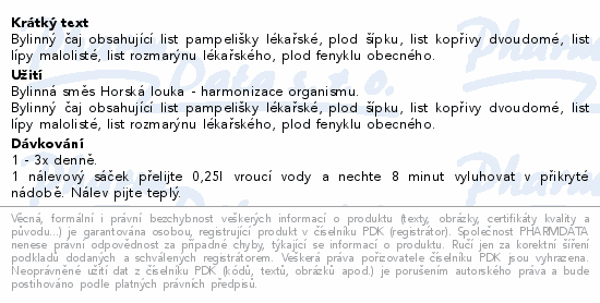 Bylinný čaj obsahující list pampelišky lékařské, plod šípku, list kopřivy dvoudomé, list lípy malolisté, list rozmarýnu lékařského, plod fenyklu obecného.