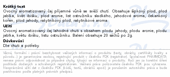 Ovocný aromatizovaný čaj příjemné vůně se svěží chutí. Obsahuje šípkový plod, plod jablka, květ ibišku, plod aronie, list ostružiníku sladkého, jahodové aroma, čekankový kořen, plod jahody, rakytníkový plod, rakytníkové aroma.