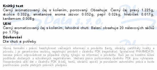 Černý aromatizovaný čaj s kořením, porcovaný. Obsahuje: Černý čaj pravý 1.225g, skořice 0.332g, smetanové aroma zázvor 0.052g, pepř 0.026g, hřebíček 0.017g, kardamom 0.008g.