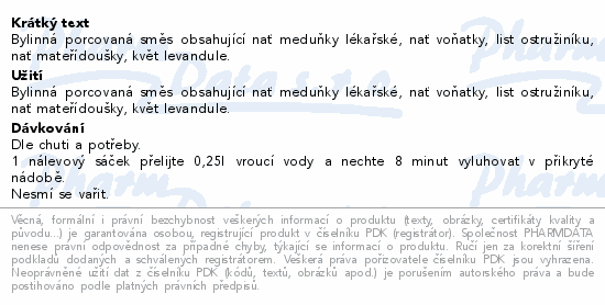 Bylinná porcovaná směs obsahující nať meduňky lékařské, nať voňatky, list ostružiníku, nať mateřídoušky, květ levandule.