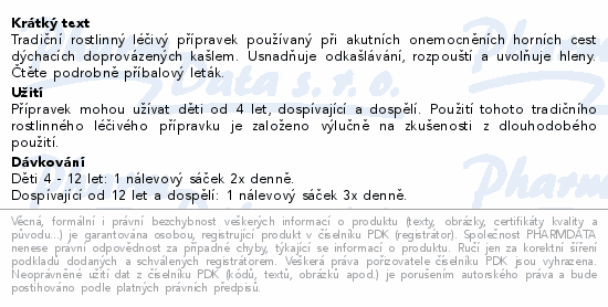Tradiční rostlinný léčivý přípravek používaný při akutních onemocněních horních cest dýchacích doprovázených kašlem. Usnadňuje odkašlávání, rozpouští a uvolňuje hleny. Čtěte pozorně příbalový leták.