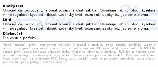 Ovocný čaj porcovaný, aromatizovaný s chutí jablka. Obsahuje jablko plod, kyselina vinná-regulátor kyselosti, ibišek súdánský květ, ostružiník sladký list, jablečné aroma.